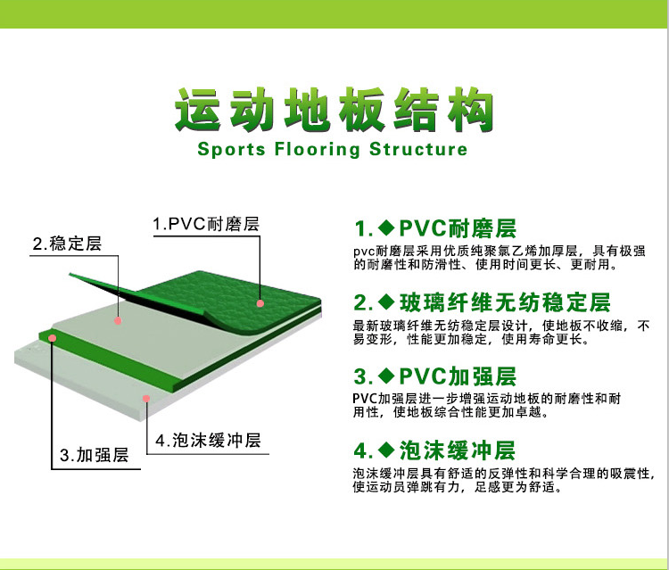 主要是應(yīng)用于體育館、健身房、乒乓球、羽毛球、臺(tái)球、籃球、網(wǎng)球、手球等室內(nèi)運(yùn)動(dòng)場(chǎng)館的塑膠地板。