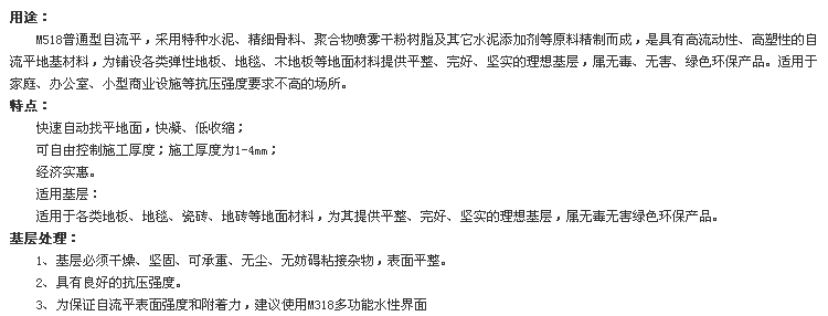 使用場所:M518普通型自流平,采用特種水泥、精細(xì)骨料、聚合物噴霧干粉樹脂及其它水泥添加劑等原料精制而成,是具有高流動性、高塑性的自流平地基材料,為鋪設(shè)各類彈性地板、地毯、木地板等地面材料提供平整、完好、堅(jiān)實(shí)的理想基層,屬無毒、無害、綠色環(huán)保