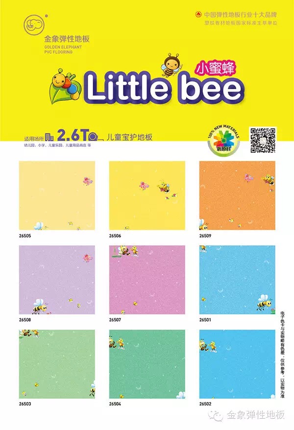 小蜜蜂系列選擇了與加強(qiáng)金貝貝一樣的2.6mm的厚度與0.35mm的耐磨層厚度,搭配4.5mm厚度的純色地板,以及1.0mm厚度的墻膠系列,全方位立體化的搭配足以應(yīng)付兒童教育領(lǐng)域日常學(xué)習(xí)、游戲、運(yùn)動(dòng)的地面空間日常要求!